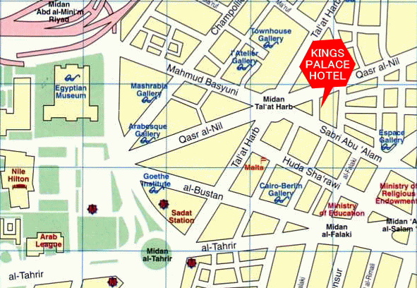 KINGS PALACE HOTEL located next to Tal`at Harb Square (Midan Tal`at Harb)just behind the square walk up qasr al-nile street across from the Air France office in the square , and take first right you will find our sign